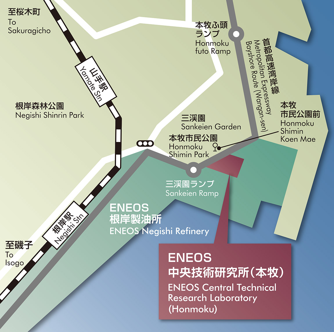 千鳥町歩道橋の信号を右折すると中央技術研究所があります。※大黒ふ頭・ベイブリッジ方面からは「本牧ふ頭ランプ」をご利用ください。(三渓園ランプは下り車線からは降りられません)