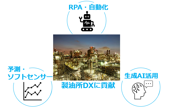 当社の収益の柱である製油所の安全・安定操業及び更なる効率化・高度化を実現するため、当社では様々な取り組みを進めています。中でも、機械学習やAIをはじめとするデジタル技術の獲得とその適用は、中央技術研究所における重要なミッションの一つとして位置づけています。以下では、製油所における様々な課題解決に向けて中央技術研究所で取り組んでいるデジタル技術活用事例について、三つのカテゴリに分けてご紹介します。