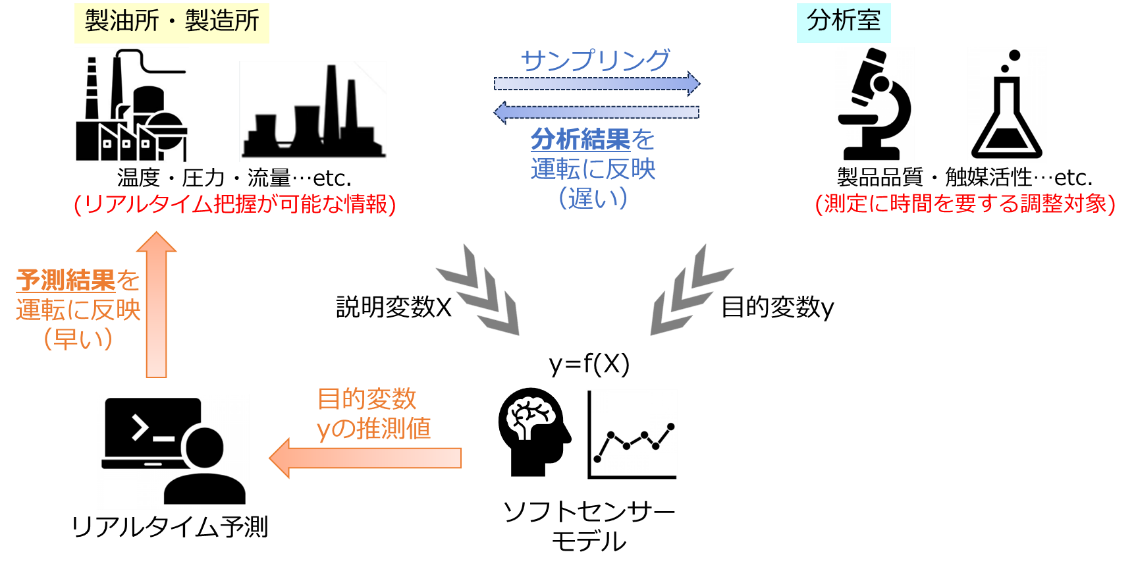 中央技術研究所では、機械学習を用いた予測や、ソフトセンサー開発により、製油所の収益力向上に貢献しています。ソフトセンサーとは、リアルタイムで計測・把握することが可能な情報を用いて、直接の測定に時間を要し、リアルタイムで把握することが困難なプロダクト性状等を予測する技術です。本技術により、監視対象のプロダクト性状等を間接的にリアルタイムで把握することが可能になることで、迅速に最適な運転調整を実施することできます。精度の高い予測モデルを構築するためには、現場プロセスの理解やドメイン知識の獲得が不可欠であるため、今後も社内で開発する強みを活かし、製油所社員と密に連携しながら、実用的で実効性のあるソリューションを提供してまいります。