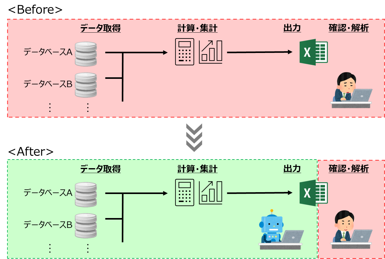 昨今、あらゆる職場において、定常業務の効率化と、より高付加価値な業務へのシフトが求められています。RPA (Robotic Process Automation) は、繰り返し発生するルーティン業務を、ロボットやプログラムに代行させる技術であり、業務効率化の強力な手段となります。中央技術研究所では、プログラミング言語やRPAツールを活用し、製油所で使用されるプロセスシミュレータの活用の自動化や、全製油所で1回/月の頻度で作成する腐食環境監視レポートの作成の自動化など、製油所における定常業務の自動化・効率化に貢献しています。これらはいずれも、データの取得、計算、集計、アウトプットといった一連の処理を全て自動化しており、その間、社員は他の業務に時間を割くことが可能となります。今後も本技術を活用し、全社的な業務効率化に貢献してまいります。