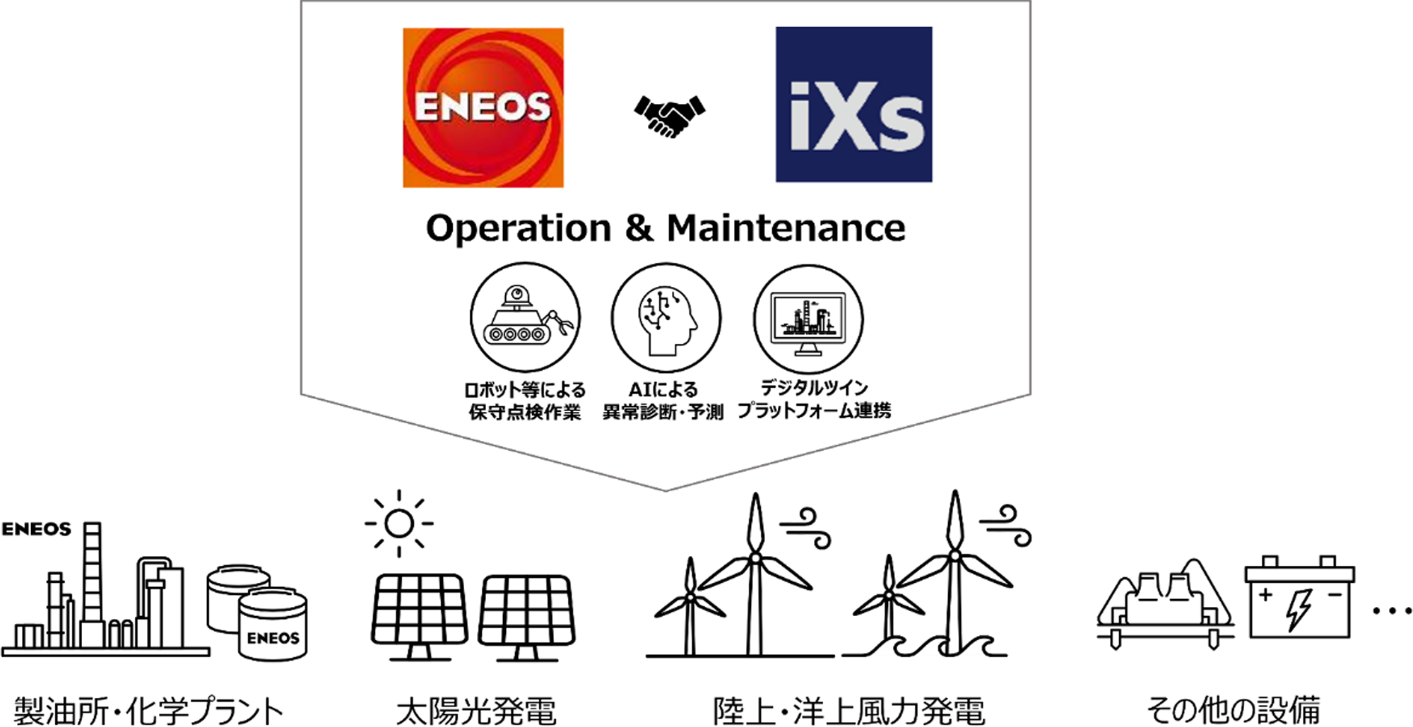 iXs社との協業では、ロボティクスを活用した先進的な保守点検サービスに向けて、『遠隔/自動操作されたロボット等によるデータ取得・補修等の保守点検作業』や『取得データのAI解析による異常診断/予測』に関する実証を行い、設備点検に特化したロボット等のハードおよびソフト開発と、データ解析等のアプリを搭載したプラットフォーム開発に取り組んでいます。